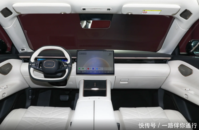 拉开车门的瞬间发现该车配备了无边框车门, 以及有双层夹胶玻璃,后排配备单层隐私玻璃。坐进车内以后,发现领克10 EM-P的内饰设计布局并没有发生太大变化,基本还是对家族设计语言的沿袭,看起来简约而富有科技感。毕竟这套设计手法没有任何毛病,不做出改变也在意料之中。不规则方向盘略显奇怪,正前方配备一个细长条仪表盘,面积不大但展示的内容不少,当然HUD抬头显示不会落下。